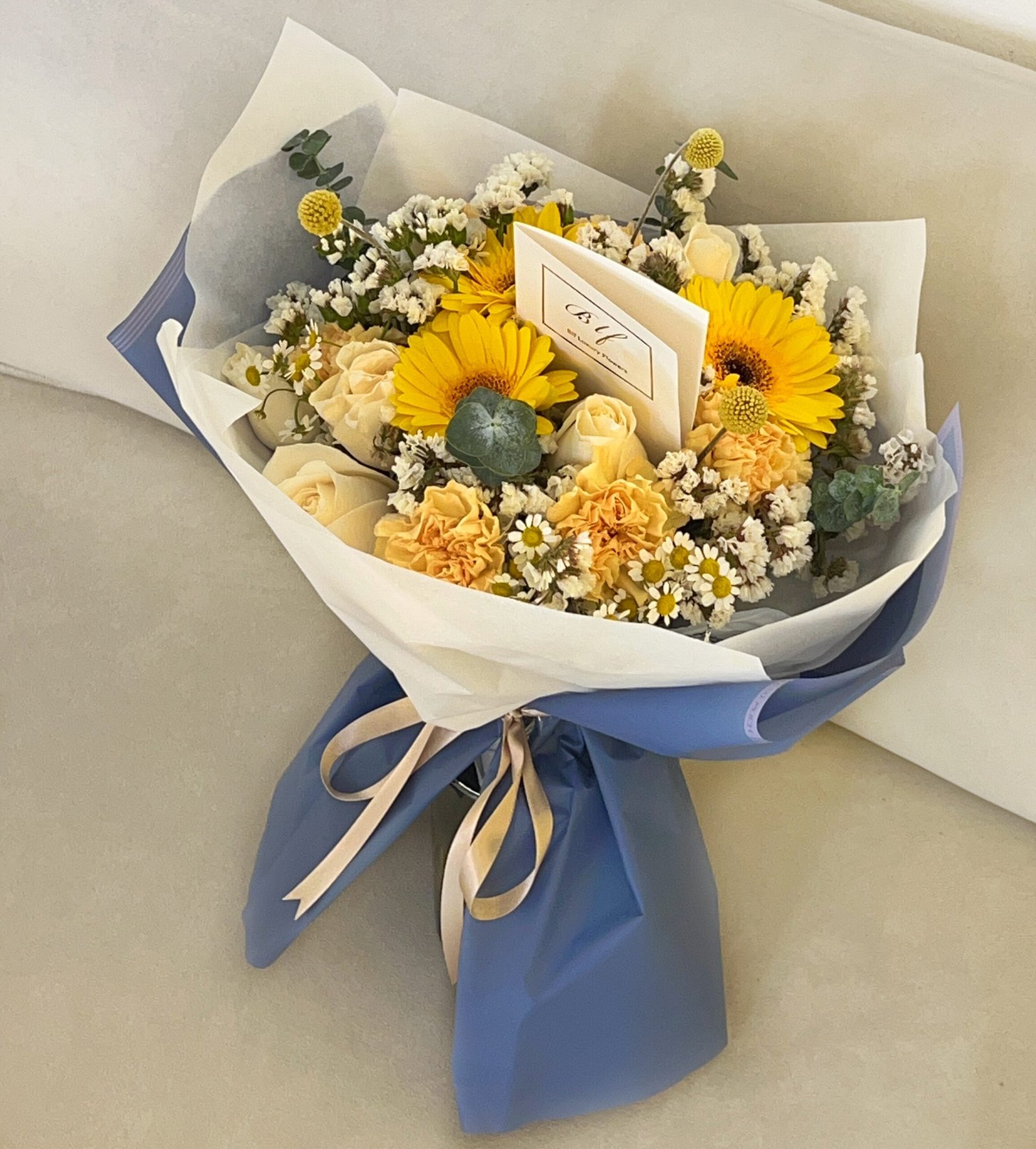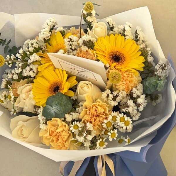 Un detalle que ilumina, abraza y llena de energía cualquier momento…Bouquet, combinación de flores, rosas y follaje en tonos cálidos cubierto con papel seda y nuestro exclusivo papel coreano importado. Incluye tarjeta personalizada e instrucciones y alimento floral.