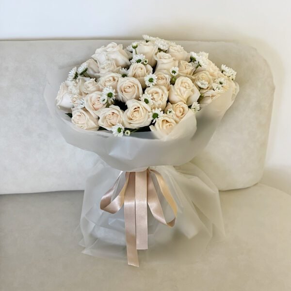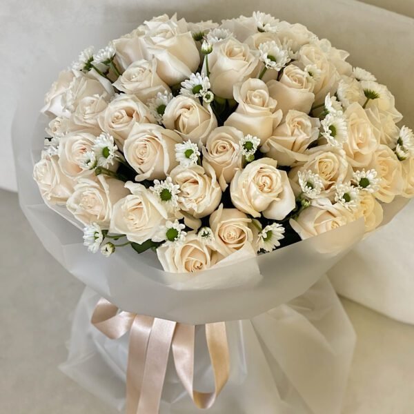 La belleza de lo elemental, composición de 45 rosas tipo exportación blancas  y margaritas