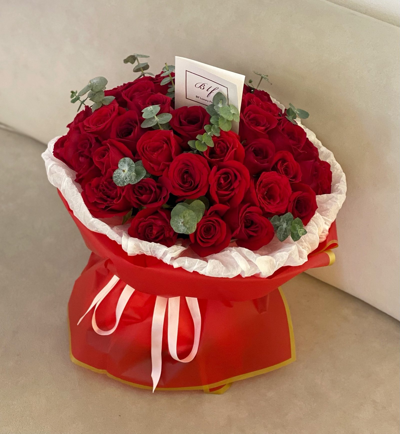 Composición de 50 rosas tipo exportación en tonalidad roja acompañado de follaje de temporada, influye bolsa, tarjeta personalizada y alimento floral
