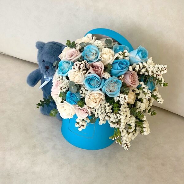 25 𝗿𝗼𝘀𝗮𝘀 𝘁𝗶𝗽𝗼 𝗲𝘅𝗽𝗼𝗿𝘁𝗮𝗰𝗶𝗼́𝗻 en tonalidades blanca, rosada y azul celeste, follaje de temporada y nuestro oso mini
