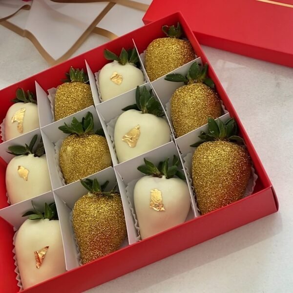 Llegó la época más linda del año, por eso hemos creado ésta edición especial para que endulces a quiénes más quieres. Fresas cubiertas de chocolate blanco decoradas con escarcha dorada y láminas de oro 24k comestible.