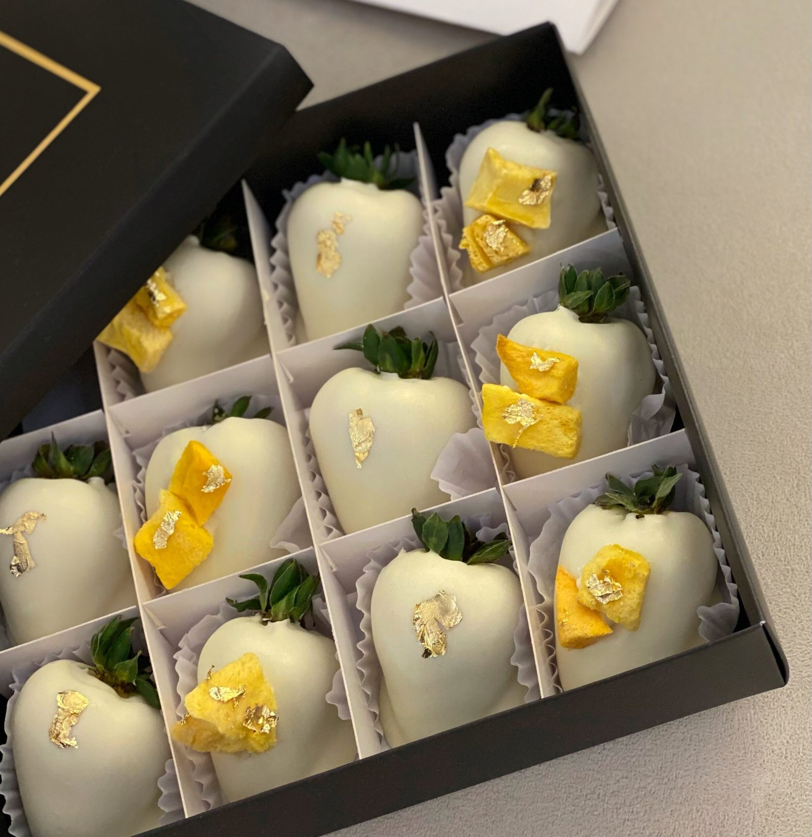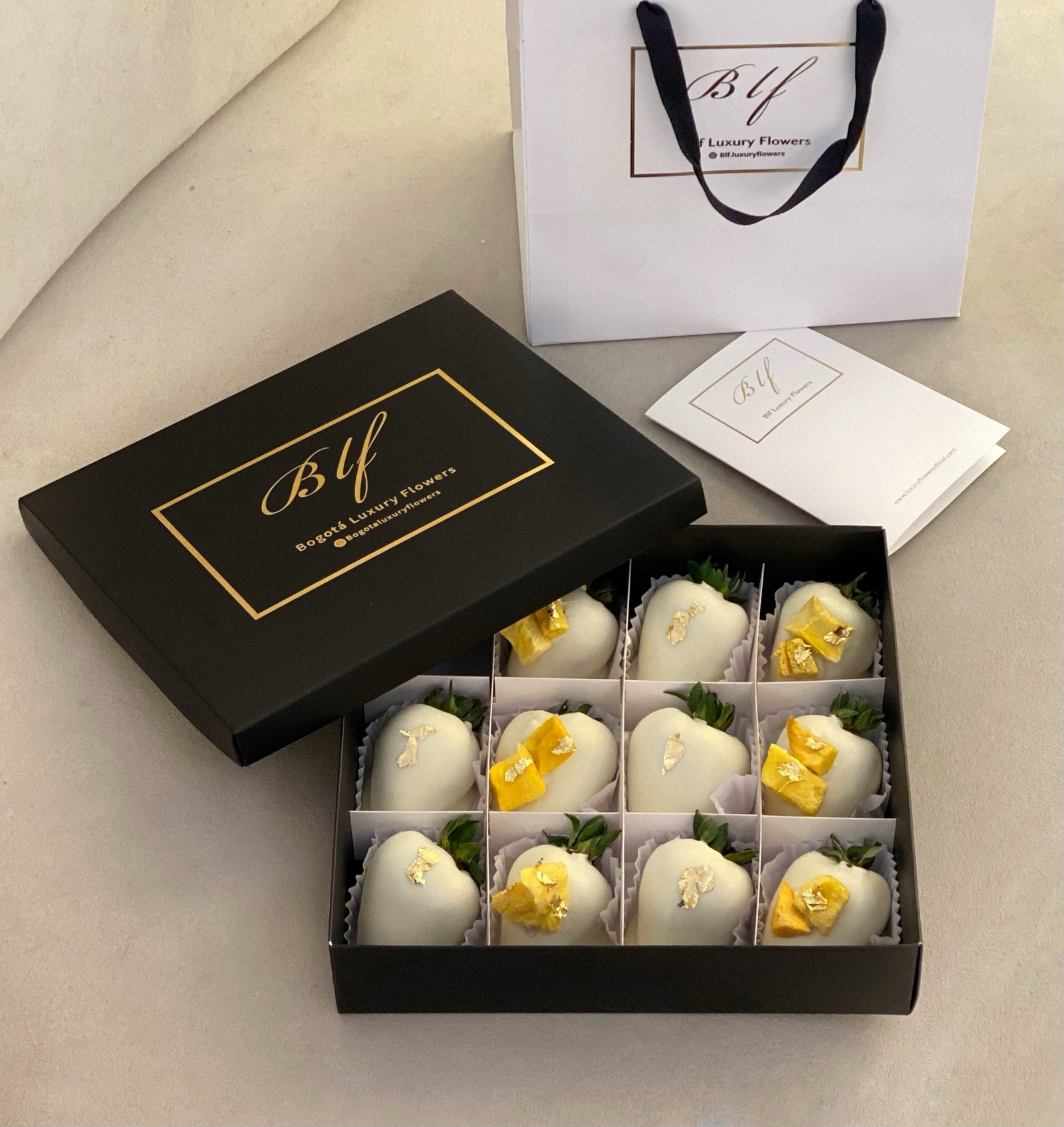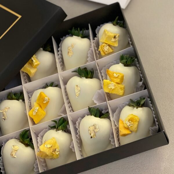 Fresas cubiertas con chocolate blanco, decoradas con finas láminas de oro 24k comestible y trozos de mango liofilizado, una mezcla de texturas y dulzura que despierta los sentidos. Incluye tarjeta personalizada e instrucciones y bolsa