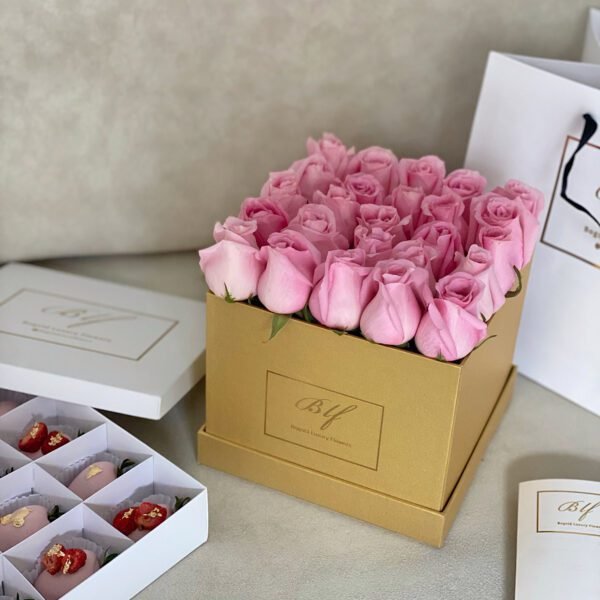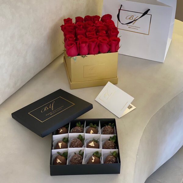 Set: caja x25 rosas tipo exportación (color a elección) + caja x12 fresas cubiertas con chocolate (diseño a elección)