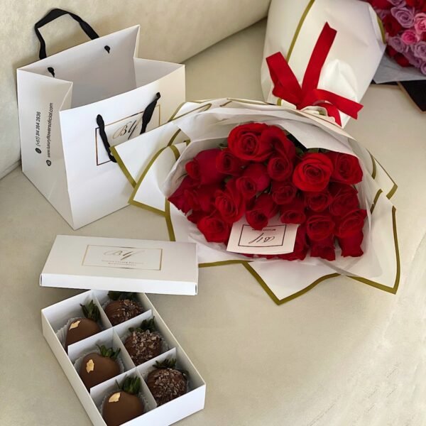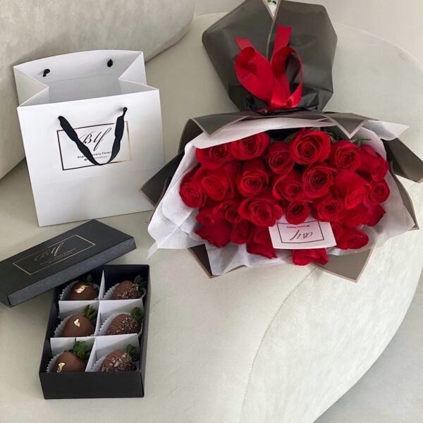 Set: Bouquet de 25 rosas tipo exportación, caja x6 fresas cubiertas con chocolate. Personalízalo a tu gusto.