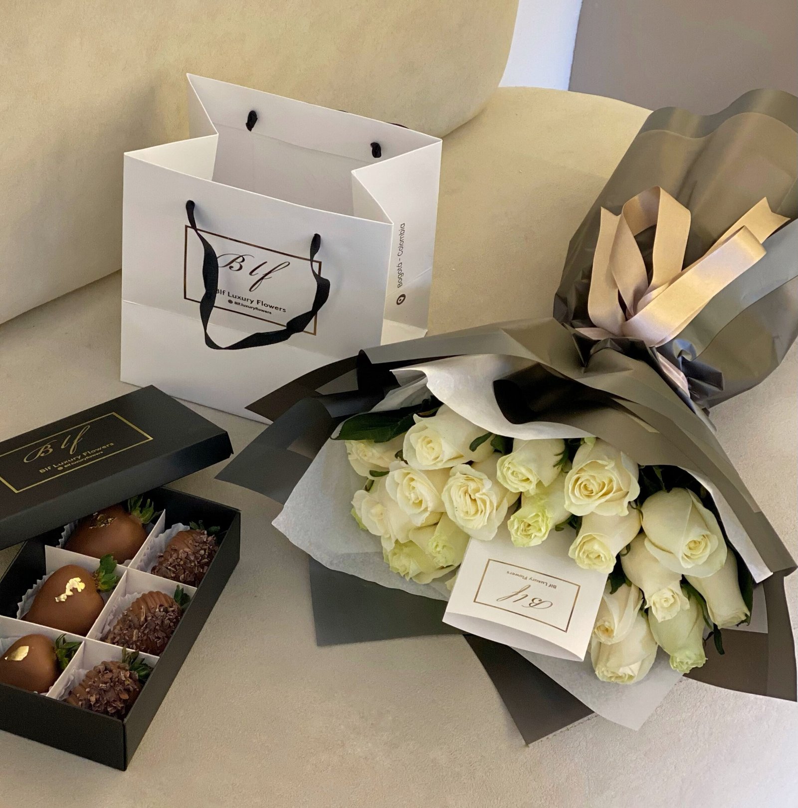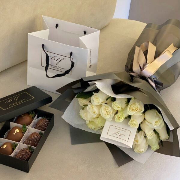 𝗦𝗘𝗧: Bouquet x25 rosas tipo exportación (color a elección) + 𝗖aja x6 fresas cubiertas con chocolate (diseño a elección) + Tarjeta personalizada e instrucciones de cuidado + Alimento floral + Bolsa
