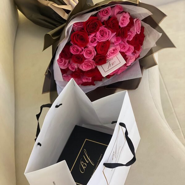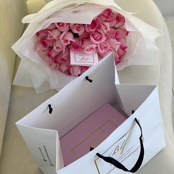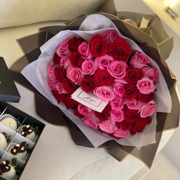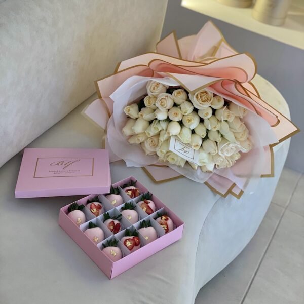 Set: Bouquet de 50 rosas tipo exportación, caja x12 fresas cubiertas con chocolate. Personalízalo a tu gusto.
