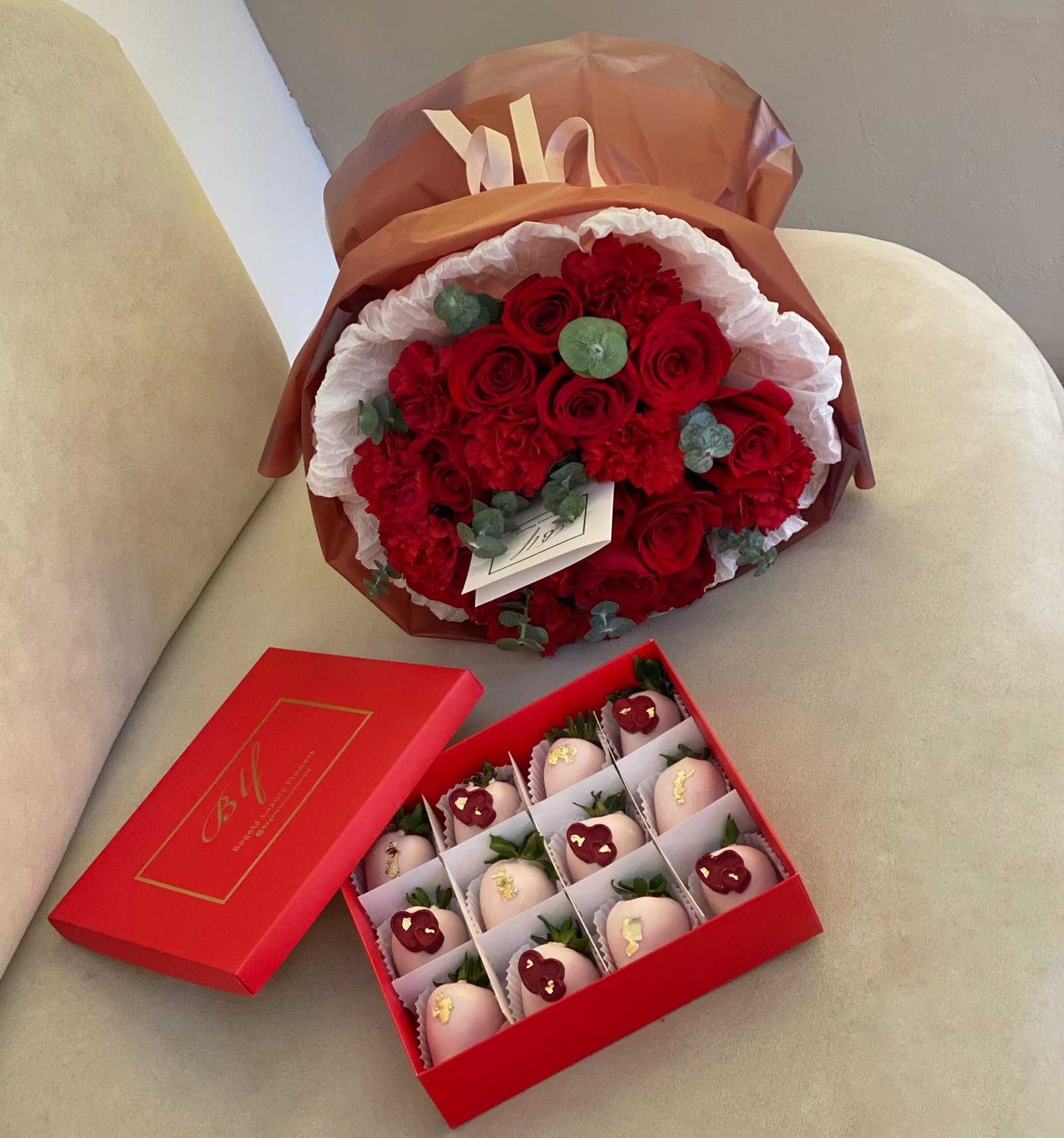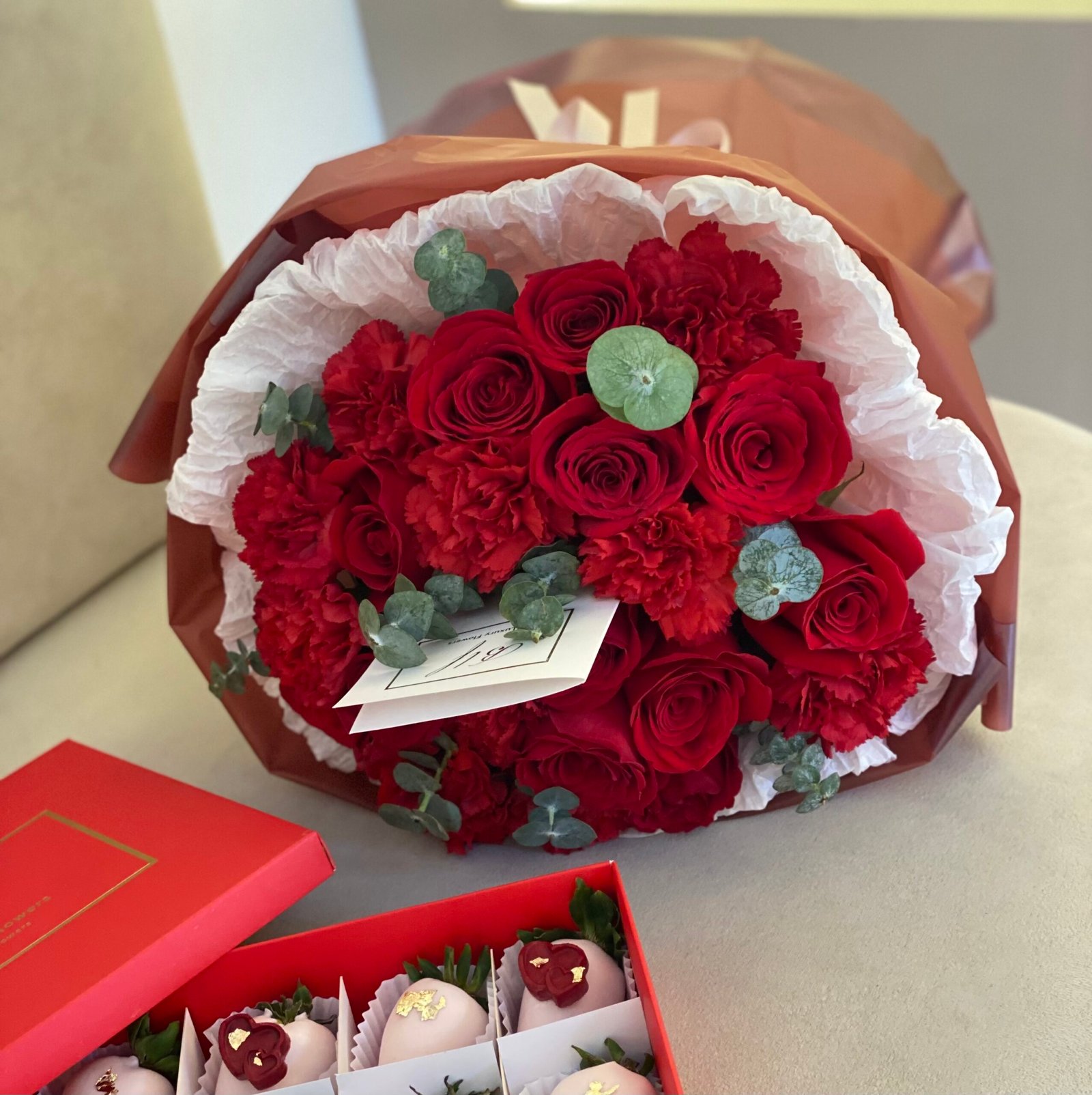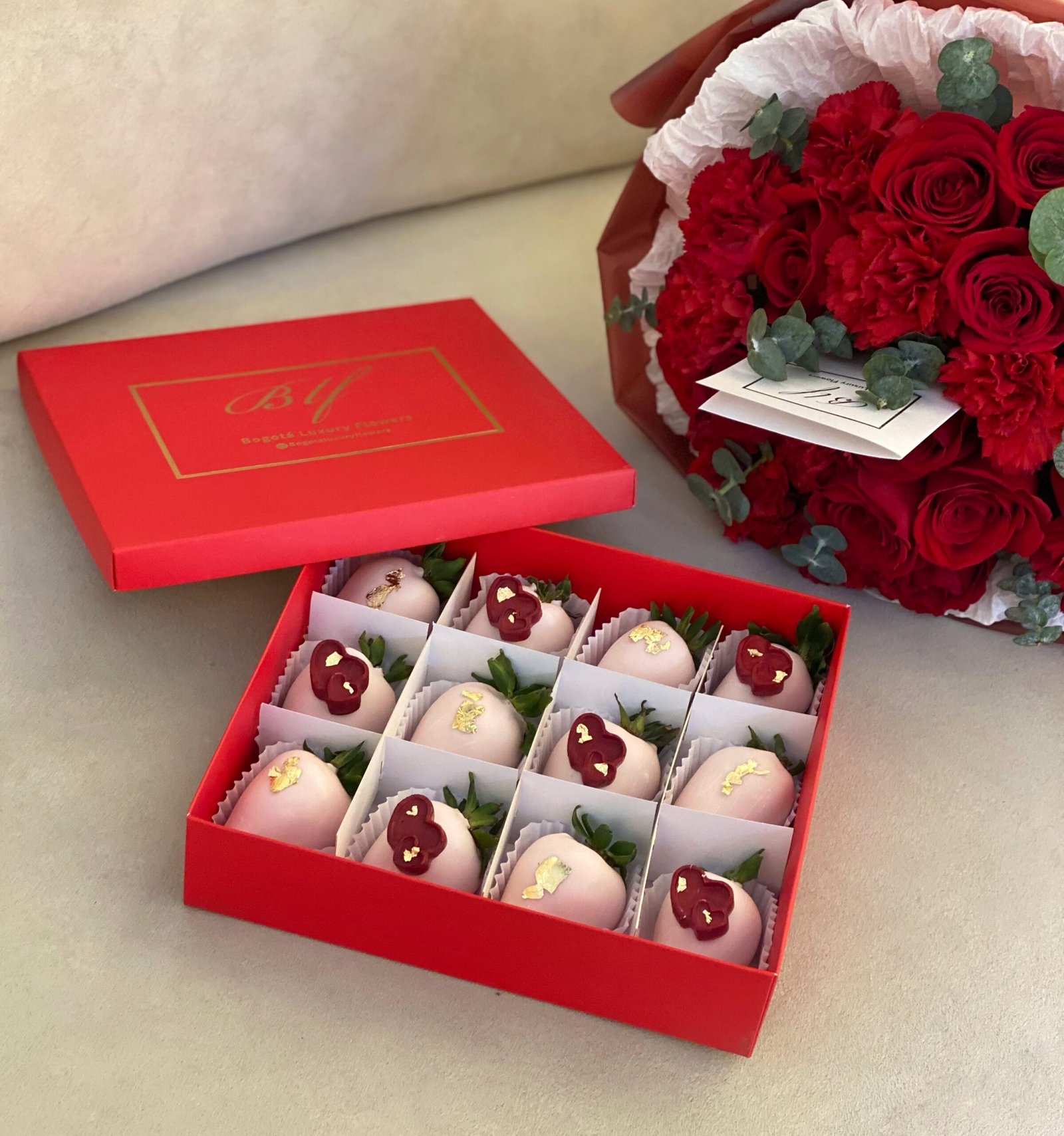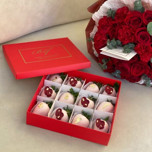 Set: Bouquet con 12 rosas rojas, clavel y follaje de temporada + caja Love x12 fresas cubiertas con chocolate blanco (tonalidad rosa) incluye bolsa, tarjeta personalizada y alimento floral