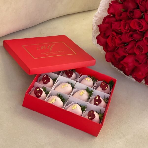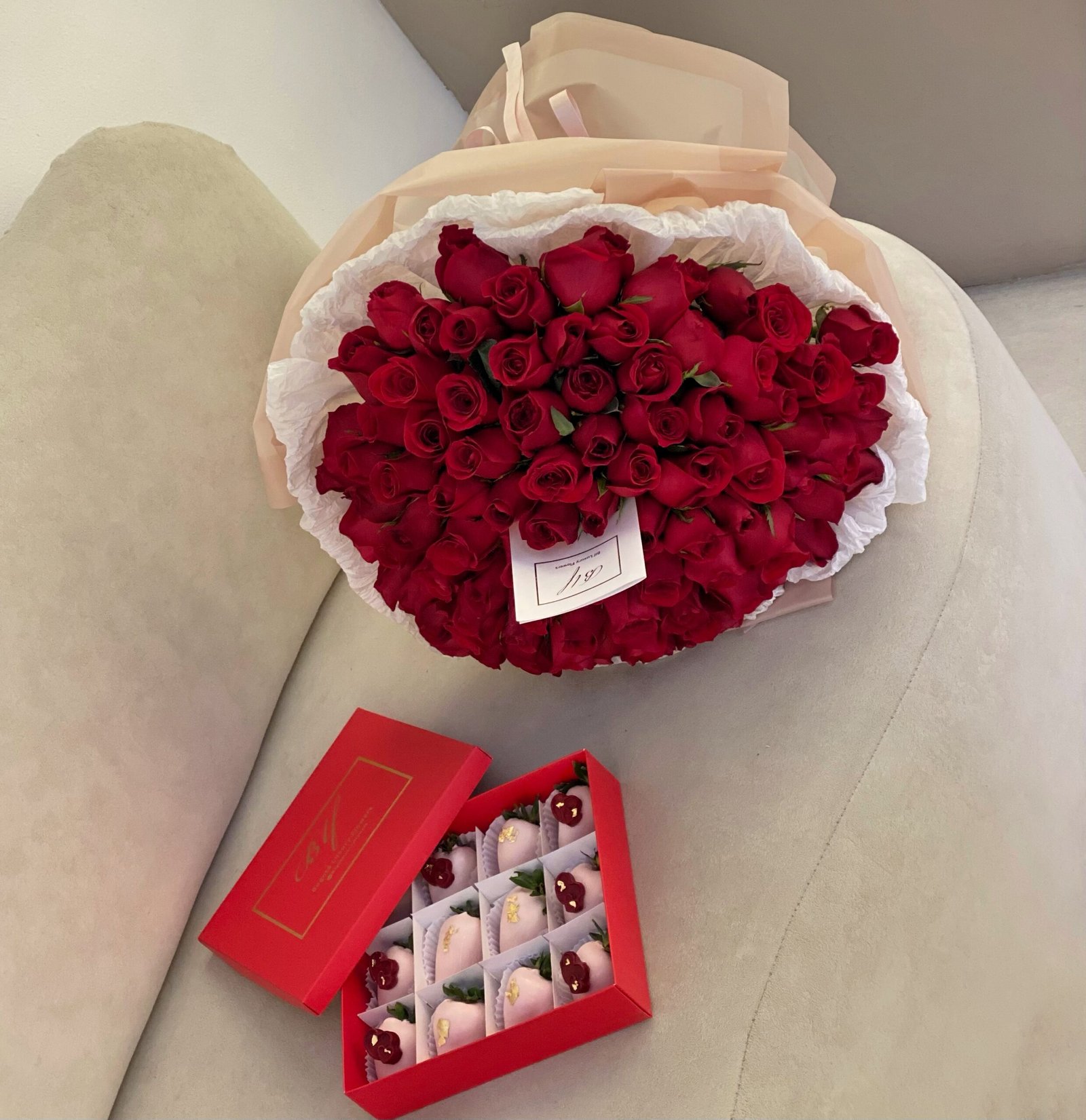 Set: Bouquet con 100 rosas rojas tipo exportación + caja Love x12 fresas cubiertas con chocolate, incluye bolsa, tarjeta personalizada y alimento floral