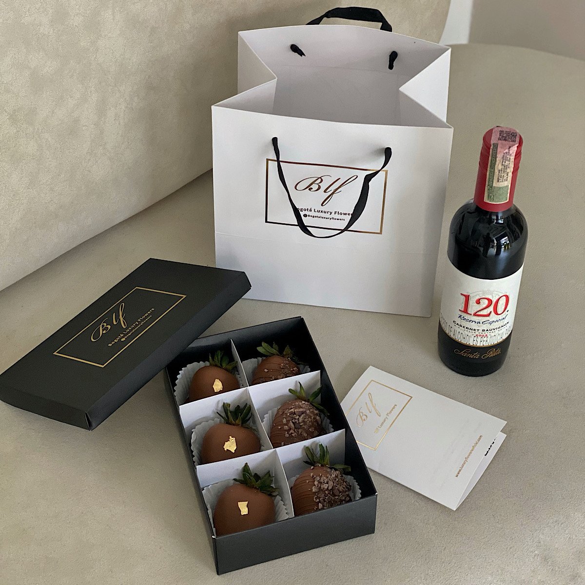 Set: Vino tinto personal 120 reserva especial y caja x6 fresas cubiertas con chocolate.