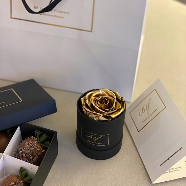 Set: caja x6 fresas con chocolate + Single rose (rosa 100% natural con duración de 3 años)